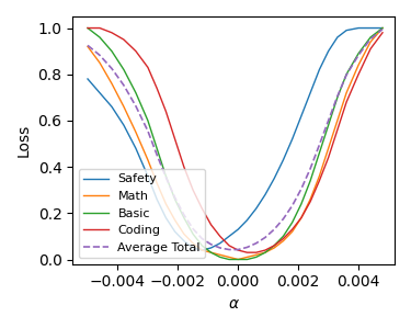 早期的多任务学习过程中经常出现不同任务之间互相博弈的情况,这也使得多任务学习中损失函数的标准化与参数化调整作为2018-2022年炼丹的重要环节,一些优化器也因此而被提出。但到了大模型,至少我们看到的Loss landscape并不够符合我们的核心观点,在作者本人使用十分钟编造数值后,他绘制出了一个自己幻想中的可靠图像: